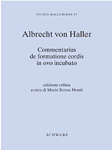 Haller, Albrecht von: Commentarius de formatione cordis in ovo incubato / edizione critica a cura di Maria Teresa Monti (Basel : Verlag Schwabe & Co, 2000, Studia Halleriana, Bd. VI). – 860 S. – + CD-ROM, - Ill. [Bibliographia Halleriana 0904].