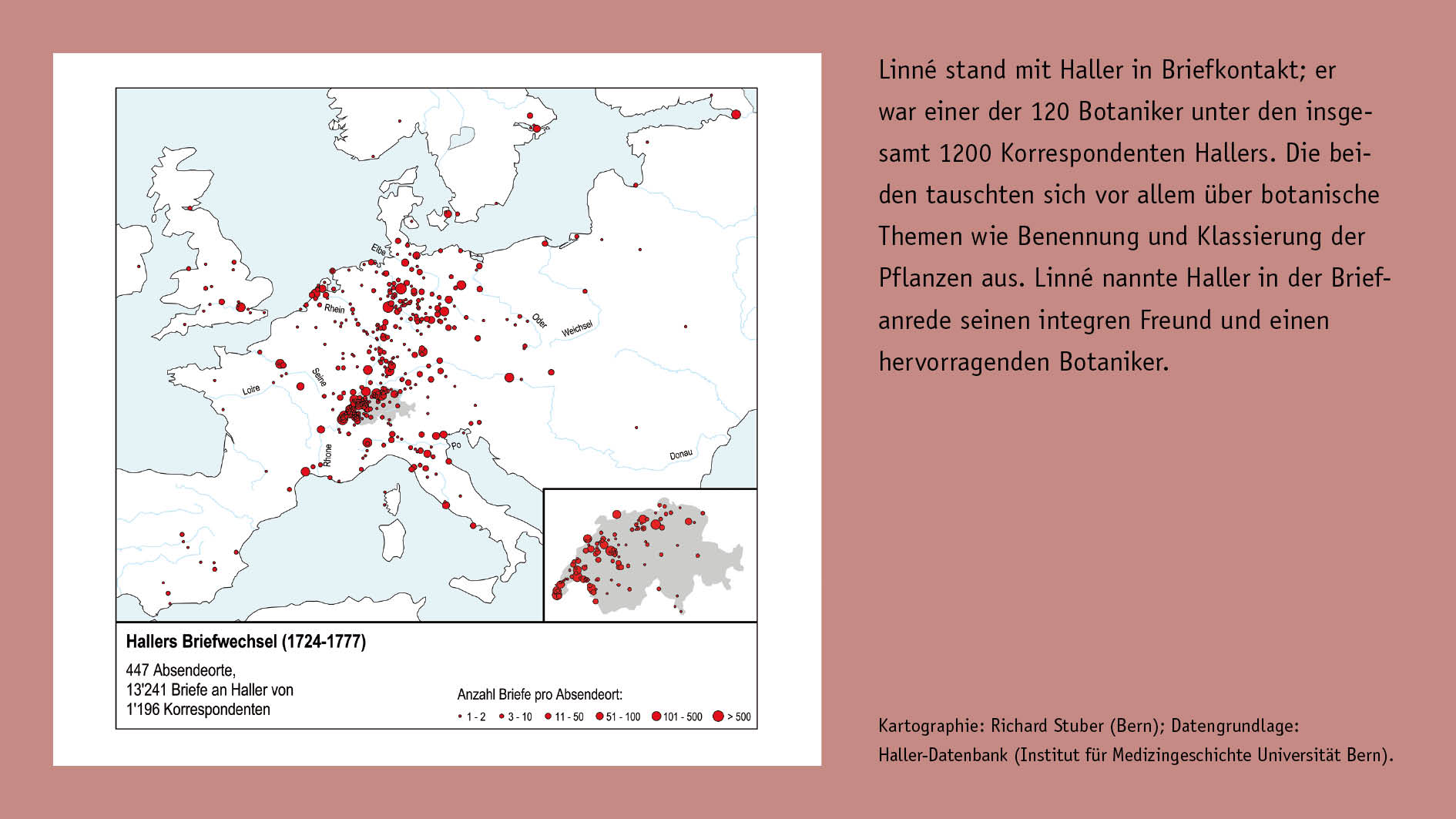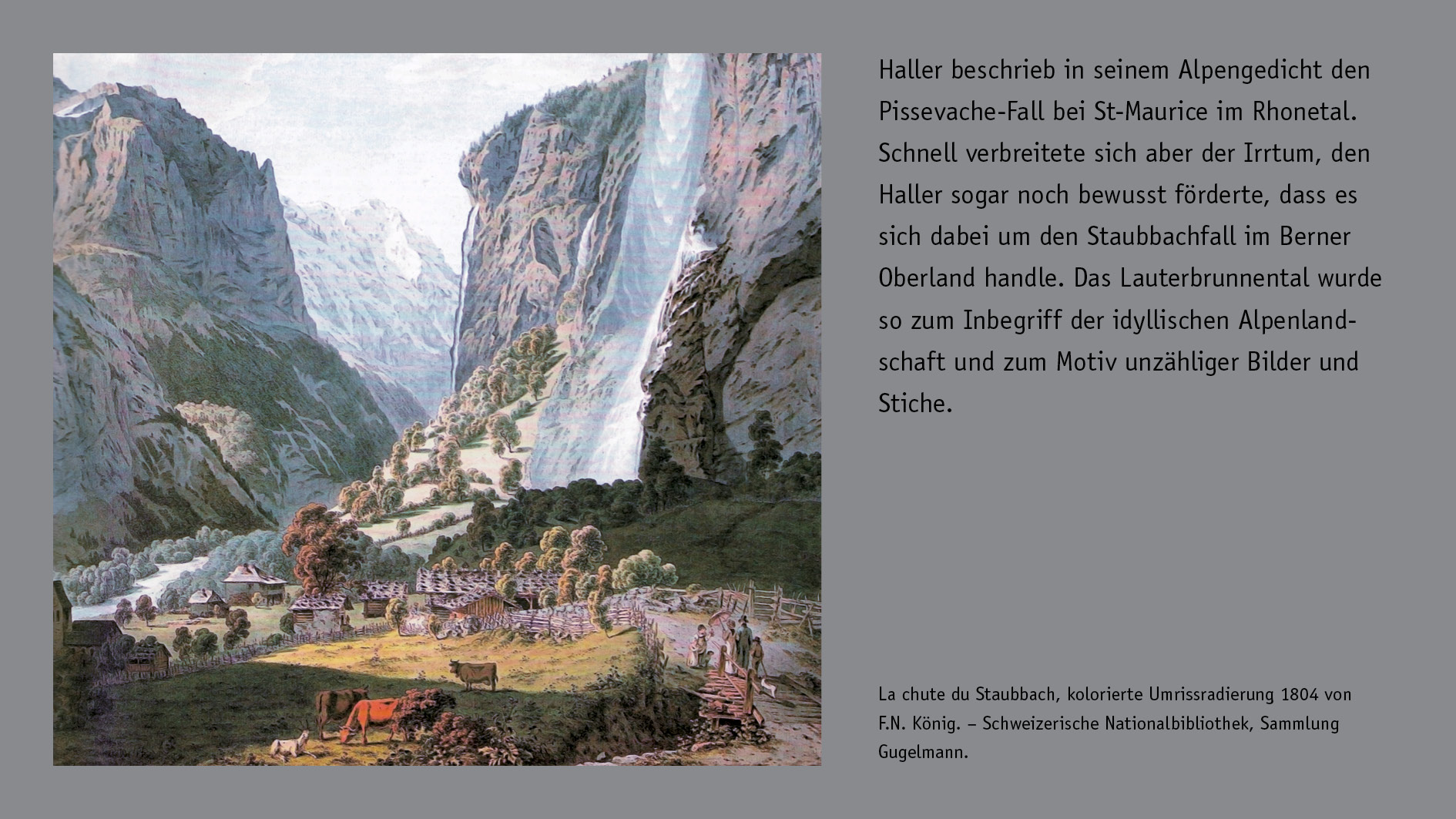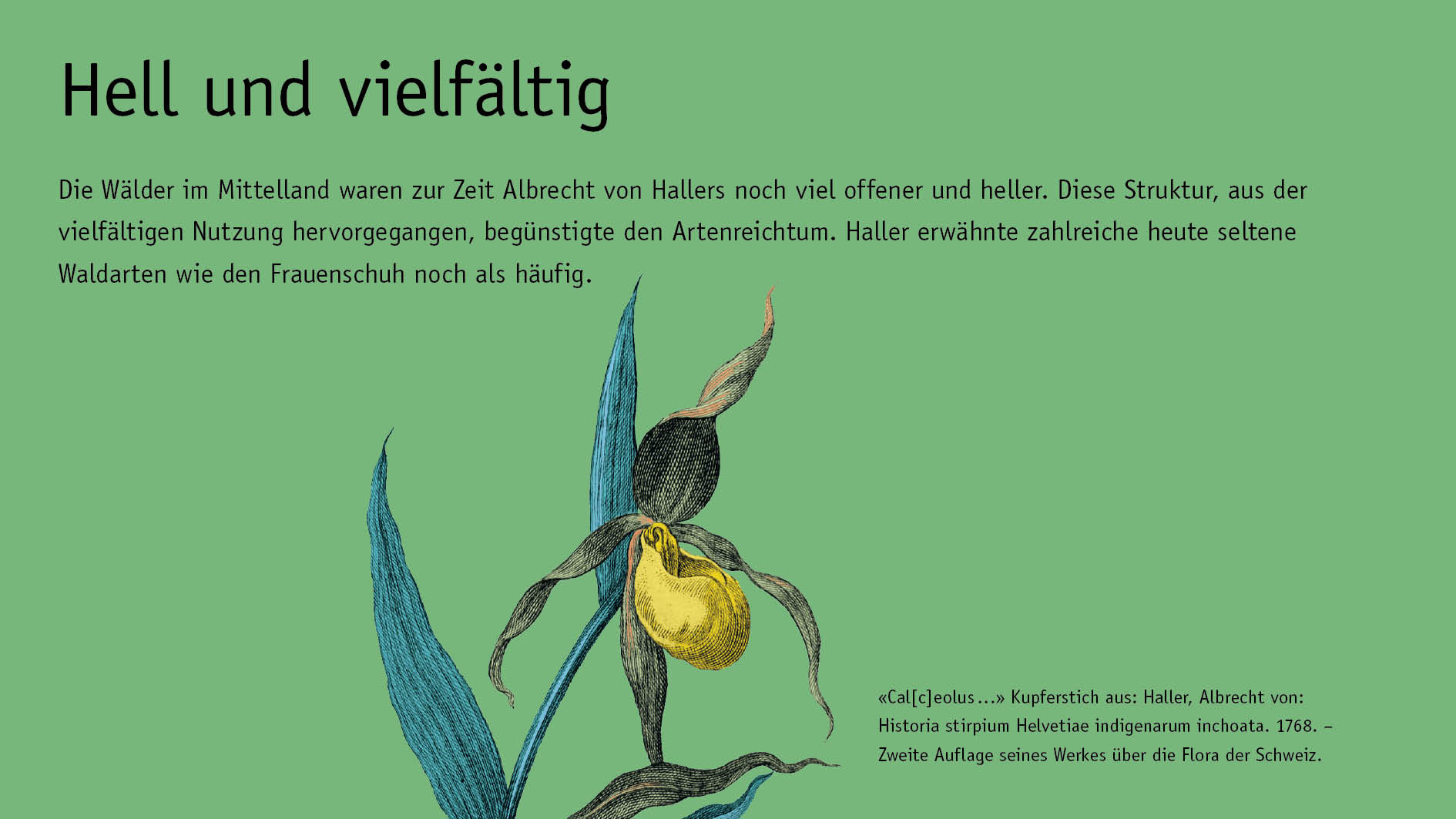 Based on the special exhibition “Hallers (G)Arten” in the Botanical Garden of Bern (BOGA) from 18 April to 24 October 2008. The German title is a wordplay based on the similarity of the words for garden (Garten) and species (Arten), alluding to Haller’s endeavours at the botanical garden in Göttingen and his research towards improving agricultural and horticultural practices, as well as his work on comprehensive flora and on individual species. The exhibition was prepared by a project group consisting of Luc Lienhard, Martin Stuber, and Sabine Tschäppler, in cooperation with the Botanical Garden of Bern (Verena Gysin, Christian Bühler, and the BOGA team of gardeners).